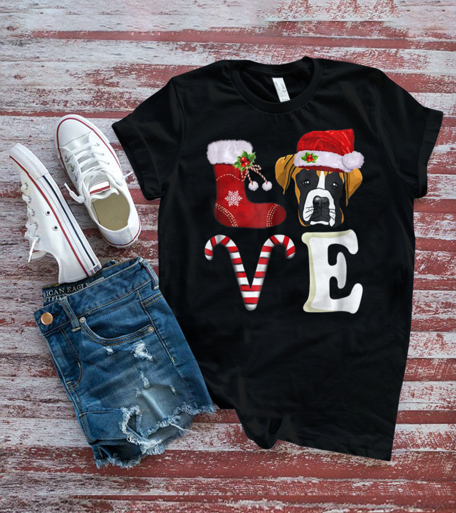 Boxer Dog Love Christmas Light With Santa Hat And Candy Cane T-Shirt