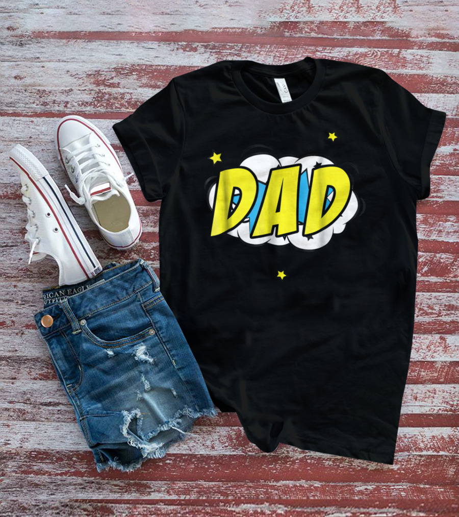 The Dad Comic Book Style Action Burst with Stars Shirt offers a regular fit. Made from 100% ring-spun cotton that is pre-shrunk to help maintain size and shape after washing. Features reinforced construction details for durability. Available in U.S. standard sizes S-5XL to accommodate various body types.