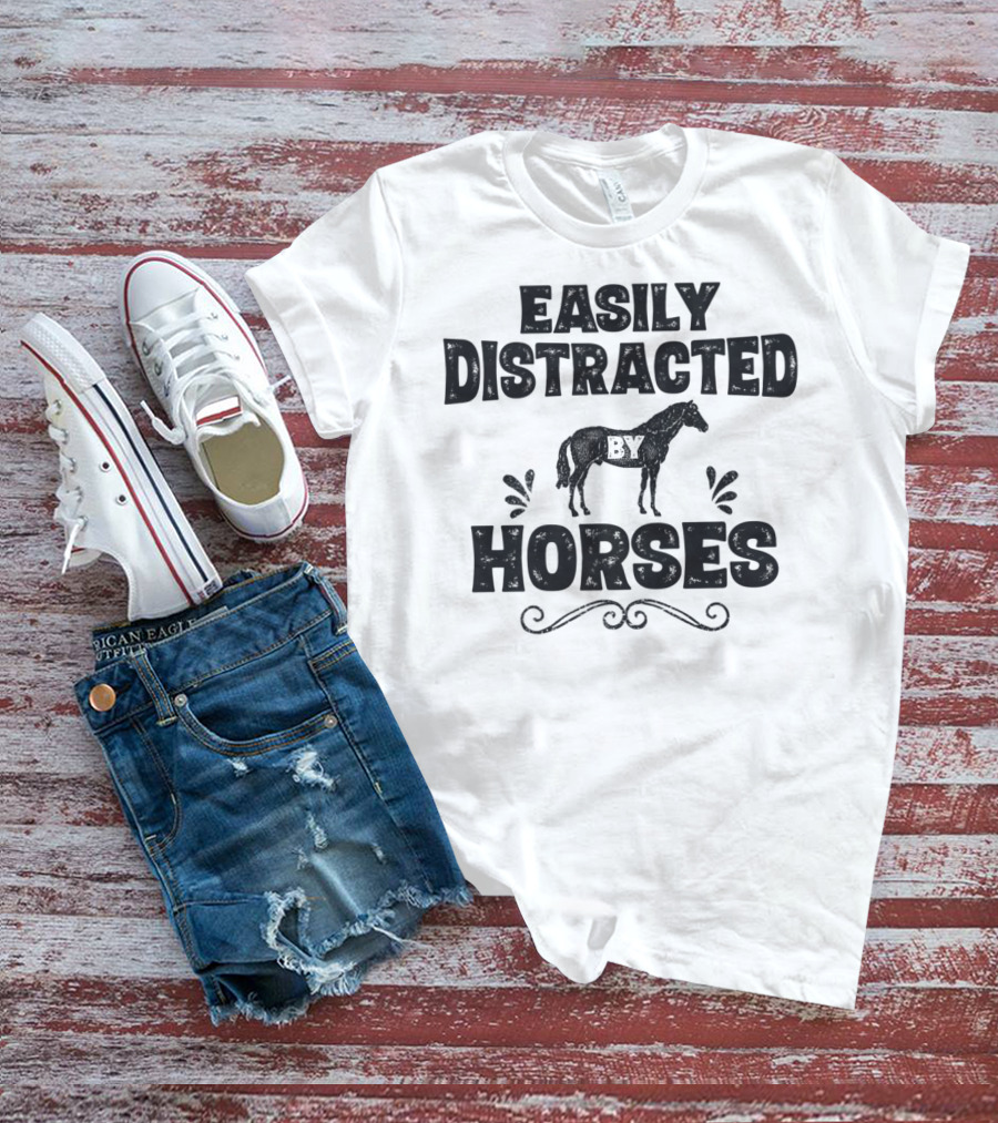 The Easily Distracted by Horses Funny Horse Girls Women Shirt offers a regular fit. Made from 100% ring-spun cotton that is pre-shrunk to help maintain size and shape after washing. Features reinforced construction details for durability. Available in U.S. standard sizes S-5XL to accommodate various body types.