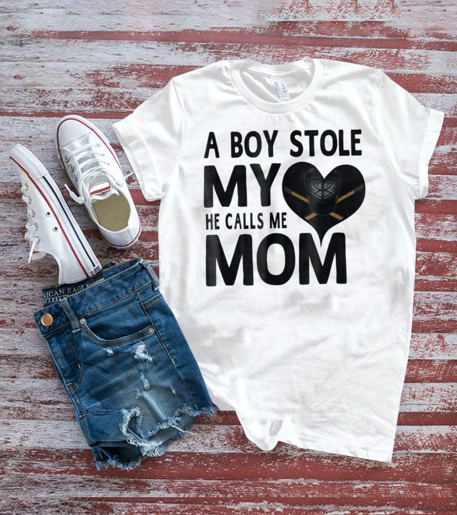 A Boy Stole My Heart He Calls Me Mom Hockey Heart Mask T-Shirt