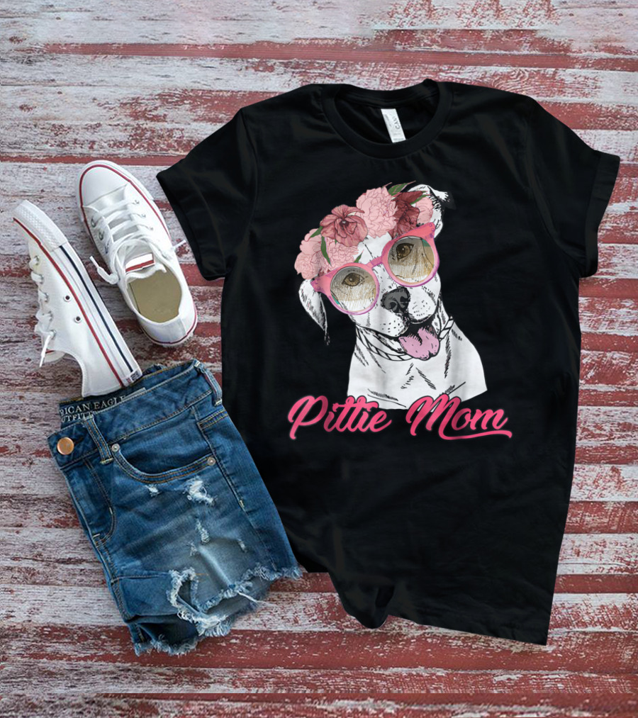 Pittie Mom With Flower Crown And Sunglasses Pitbull T-Shirt