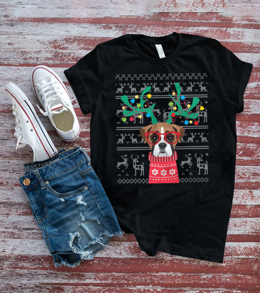 Swea Xmas Boxer Dog Reindeer Antlers Holiday Lights Ugly Christmas T-Shirt