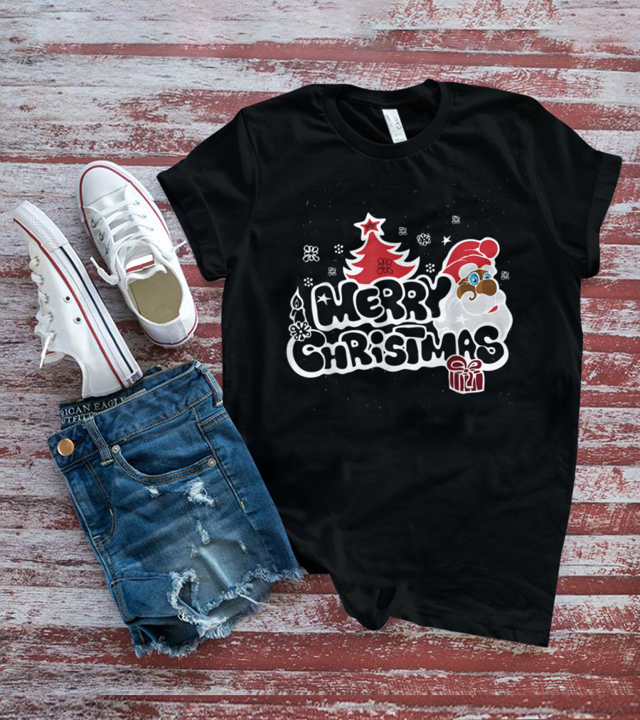 Merry Christmas Santa Red Tree Gift Black Holiday T-Shirt