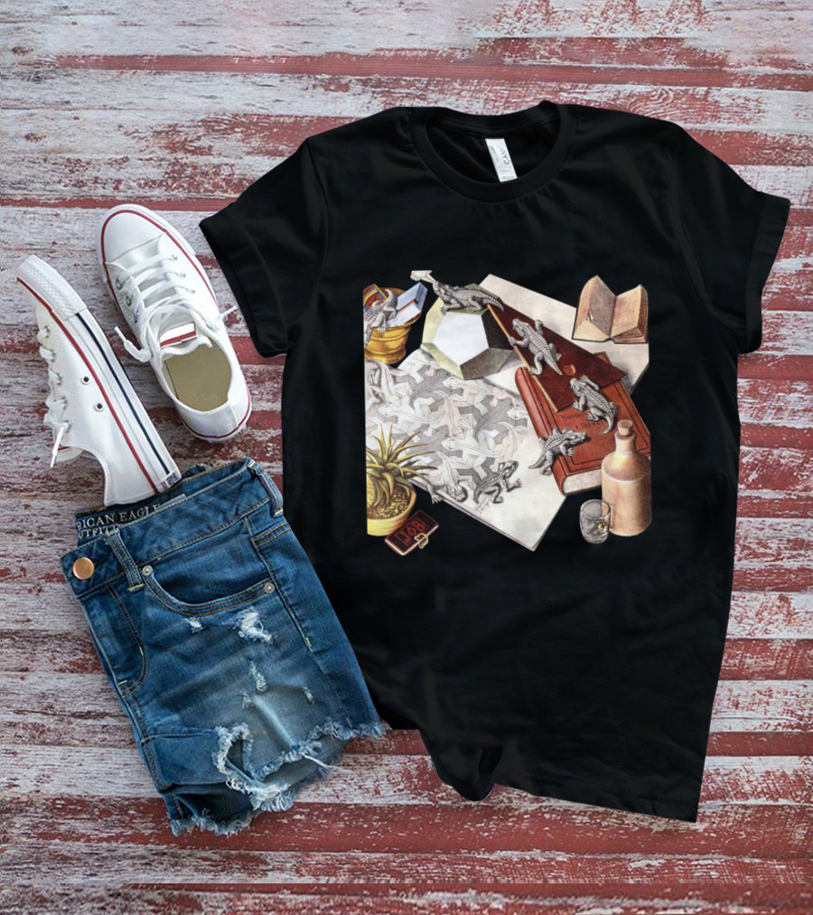 The M.c. Escher 1988 Reptiles Optical Illusion Morphing Creatures Book And Geometric Patterns Shirt offers a regular fit. Made from 100% ring-spun cotton that is pre-shrunk to help maintain size and shape after washing. Features reinforced construction details for durability. Available in U.S. standard sizes S-5XL to accommodate various body types.