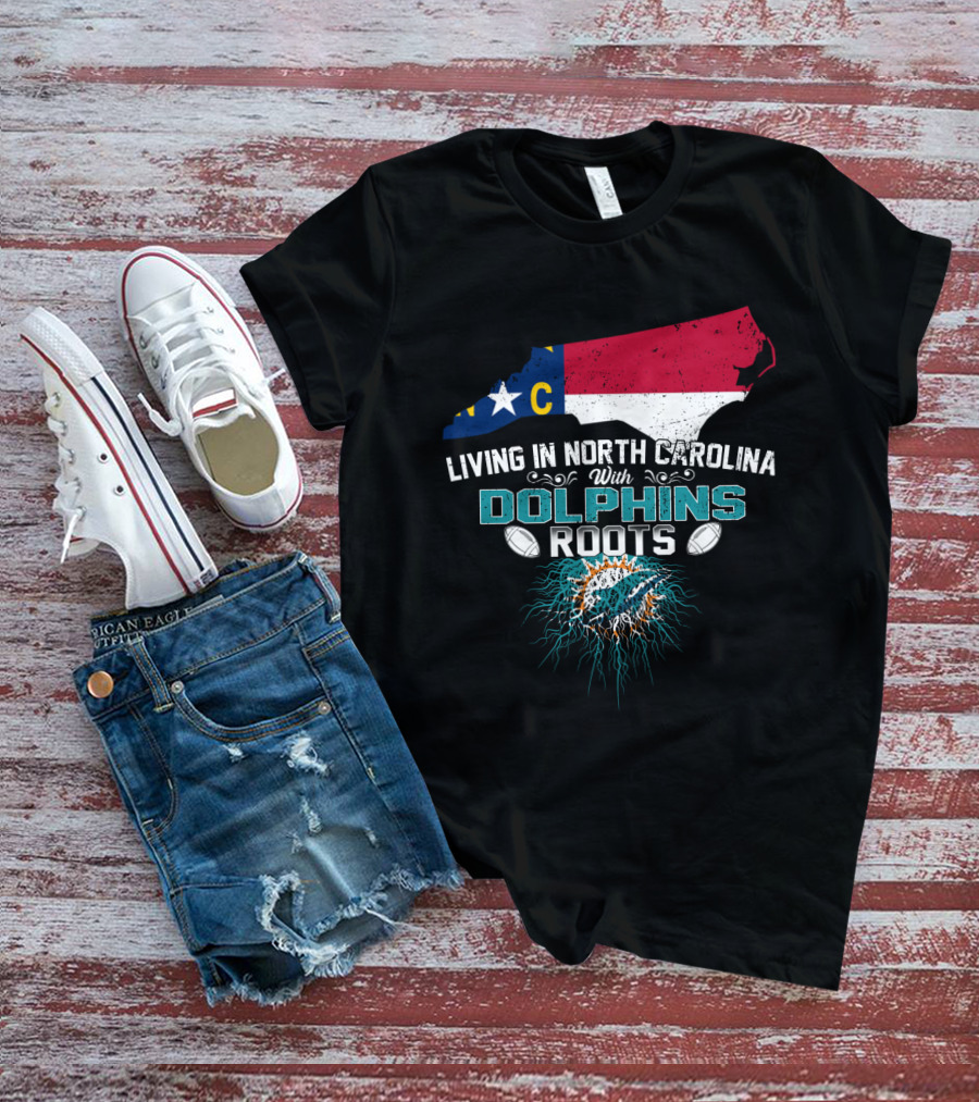 The Living in North Carolina with Miami Dolphins Roots Panthers Flag Connection Shirt offers a regular fit. Made from 100% ring-spun cotton that is pre-shrunk to help maintain size and shape after washing. Features reinforced construction details for durability. Available in U.S. standard sizes S-5XL to accommodate various body types.