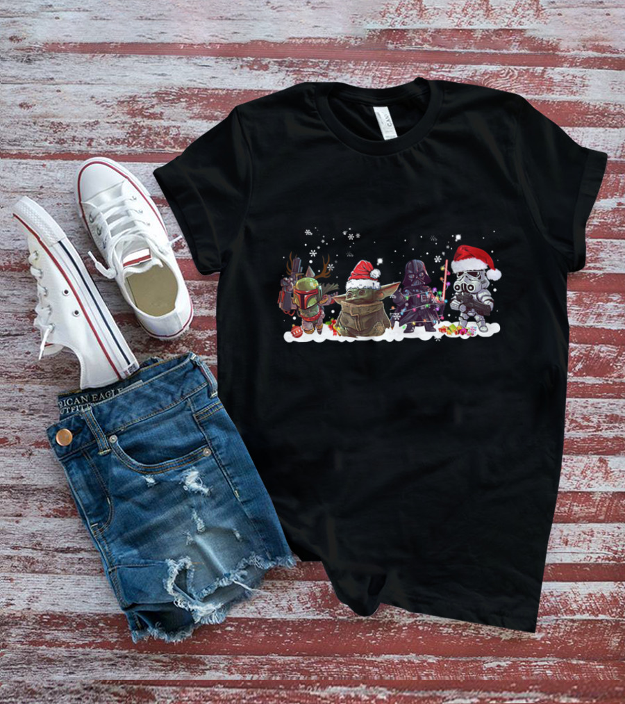 Boba Fett Baby Yoda Darth Vader And Stormtrooper Star Wars Christmas Santa Hats Snowflakes T-Shirt