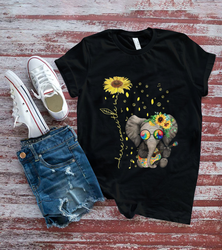 Here Comes The Sun Elephant With Sunflower And Peace Symbols T-Shirt