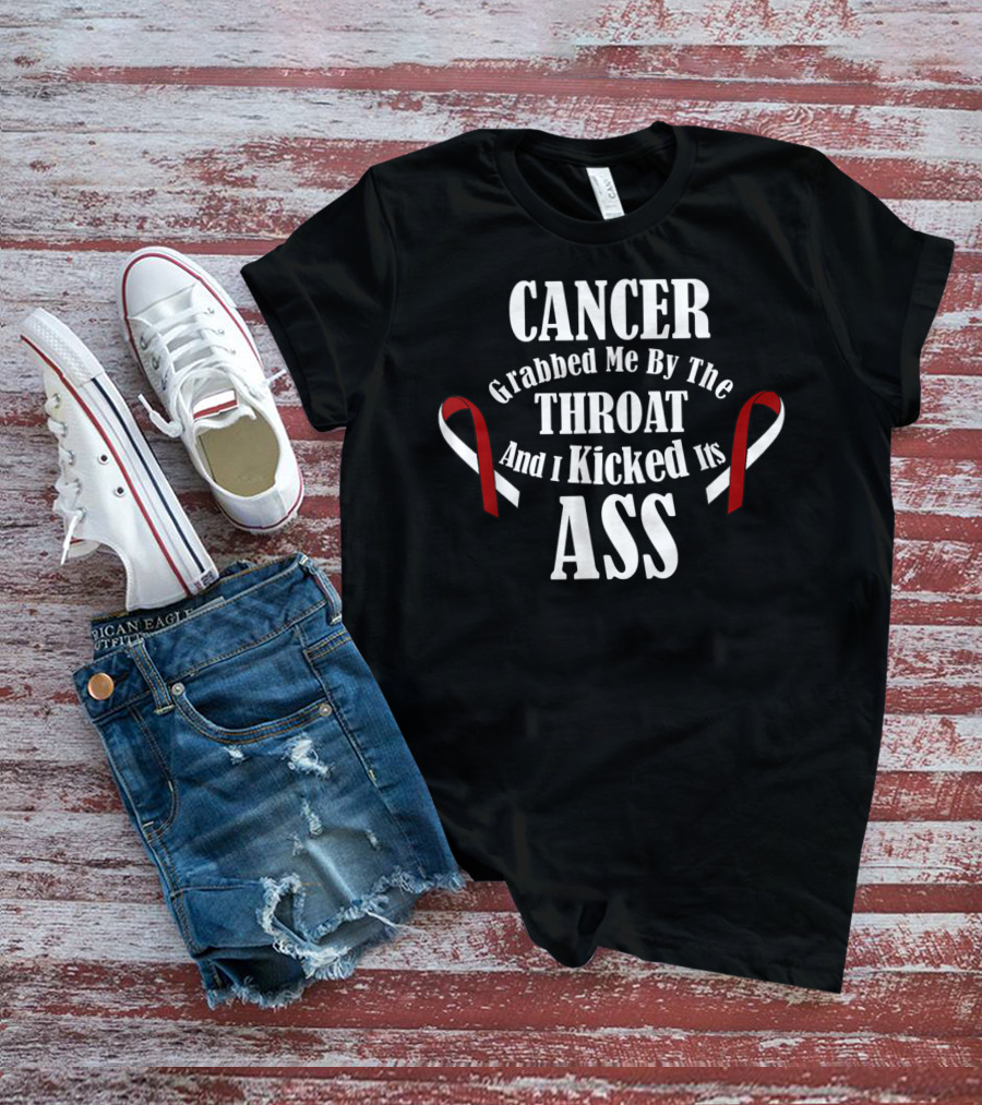 The Cancer Grabbed Me by the Throat and I Kicked Its Ass Shirt offers a regular fit. Made from 100% ring-spun cotton that is pre-shrunk to help maintain size and shape after washing. Features reinforced construction details for durability. Available in U.S. standard sizes S-5XL to accommodate various body types.