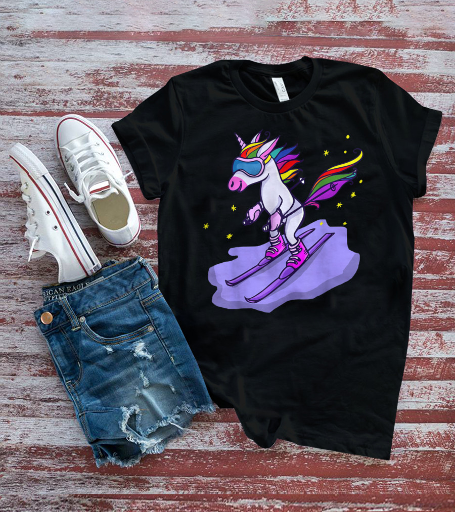 Cute Unicorn Skiing In Rainbow T-Shirt