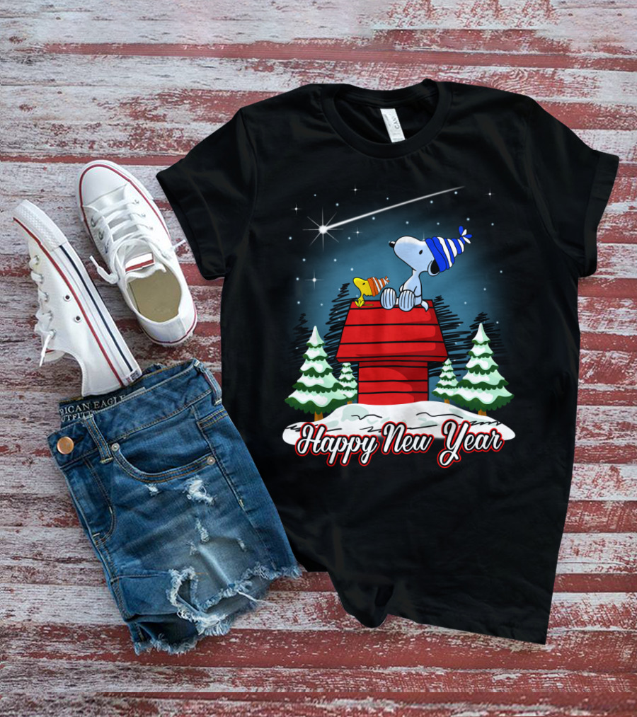 Snoopy Happy New Year With Woodstock On Doghouse Under Starry Sky T-Shirt