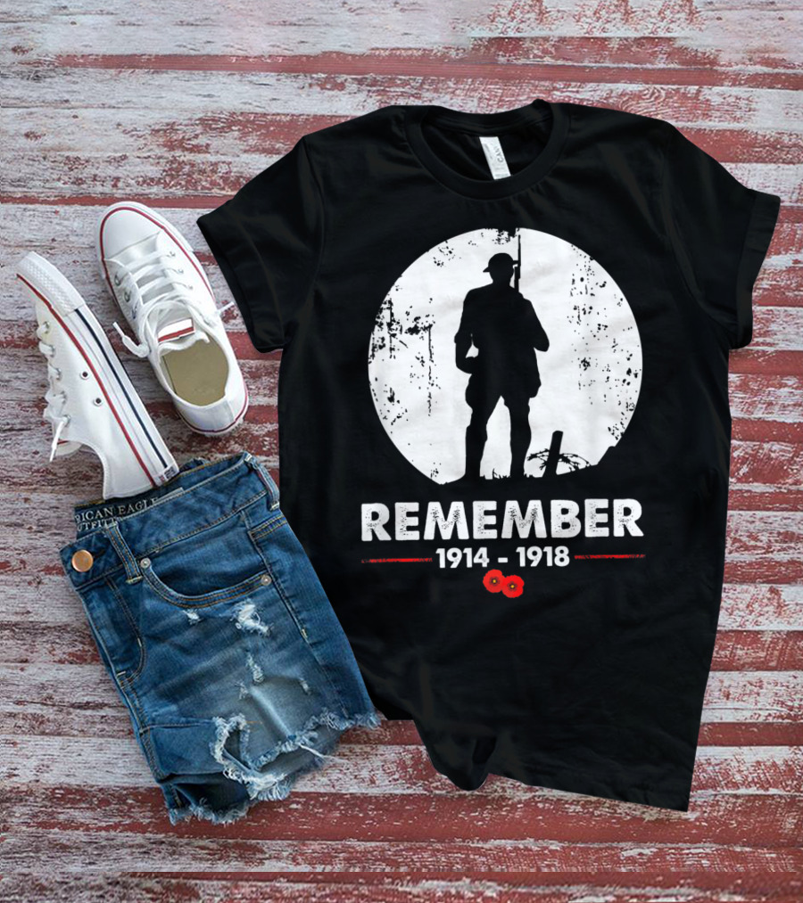 The World War 1 Remember 1914-1918 Soldier Silhouette with Poppies Shirt offers a regular fit. Made from 100% ring-spun cotton that is pre-shrunk to help maintain size and shape after washing. Features reinforced construction details for durability. Available in U.S. standard sizes S-5XL to accommodate various body types.