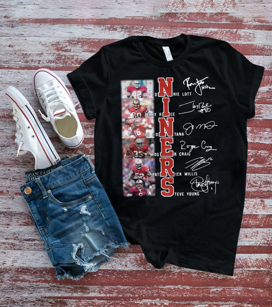 The Niners Ronnie Lott Jerry Rice Joe Montana Roger Craig Patrick Willis Steve Young Signatures Shirt offers a regular fit. Made from 100% ring-spun cotton that is pre-shrunk to help maintain size and shape after washing. Features reinforced construction details for durability. Available in U.S. standard sizes S-5XL to accommodate various body types.