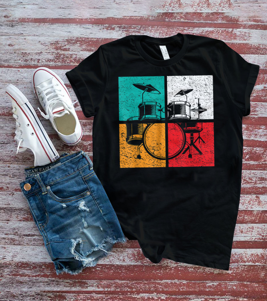 The Drummer Drums Band Drumset Colorful Pop Art Squares Shirt offers a regular fit. Made from 100% ring-spun cotton that is pre-shrunk to help maintain size and shape after washing. Features reinforced construction details for durability. Available in U.S. standard sizes S-5XL to accommodate various body types.