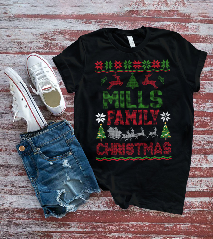 Mills Family Christmas Reindeer Sleigh Ugly Sweater Holiday Trees T-Shirt