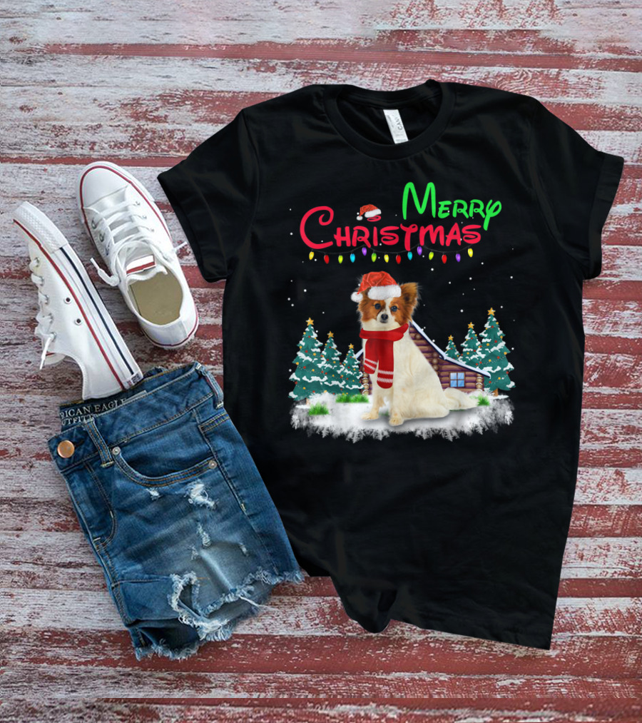 Papillon Dog With Santa Hat And Christmas Lights In Snowy Holiday Scene T-Shirt