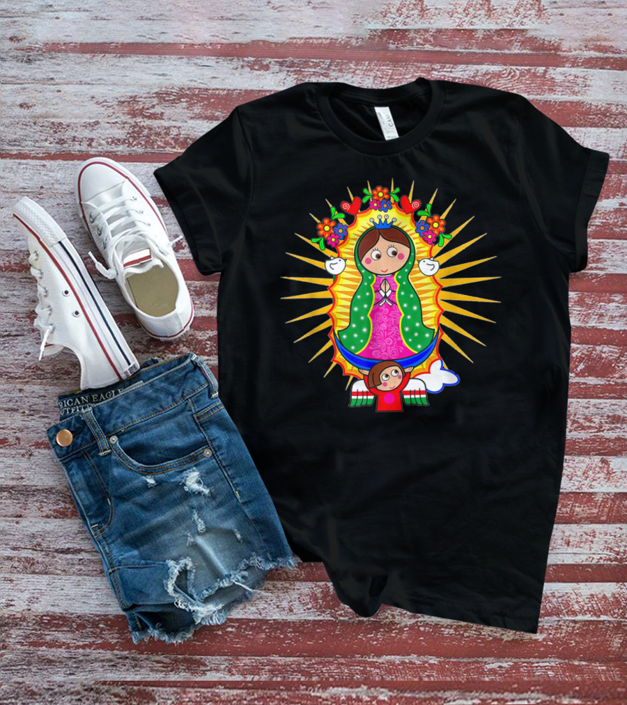 Virgen De Guadalupe Cartoon Mexican Folk Art Angel Children Flowers Sacred Image T-Shirt
