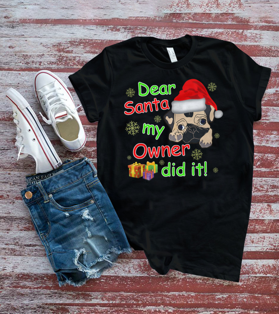 Dear Santa My Owner Did It Pug Santa Hat Snowflakes Presents T-Shirt