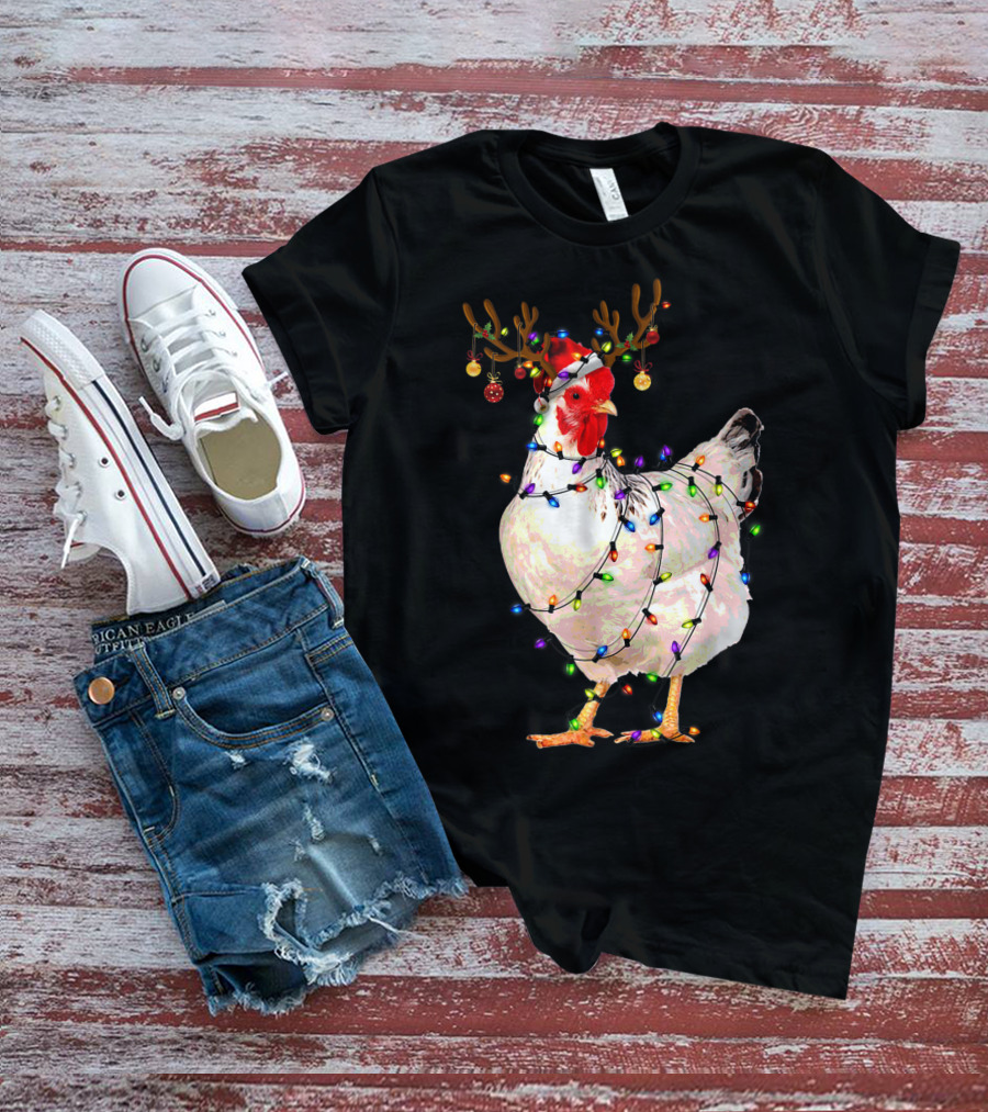 Funny Chicken Wearing Reindeer Antlers And Christmas Lights T-Shirt