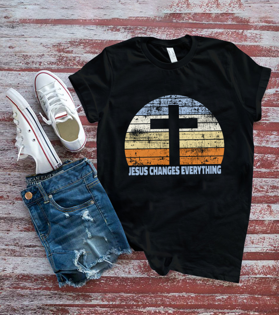 The Faith Cross Jesus Changes Everything Vintage Christian Retro Sunset Shirt offers a regular fit. Made from 100% ring-spun cotton that is pre-shrunk to help maintain size and shape after washing. Features reinforced construction details for durability. Available in U.S. standard sizes S-5XL to accommodate various body types.