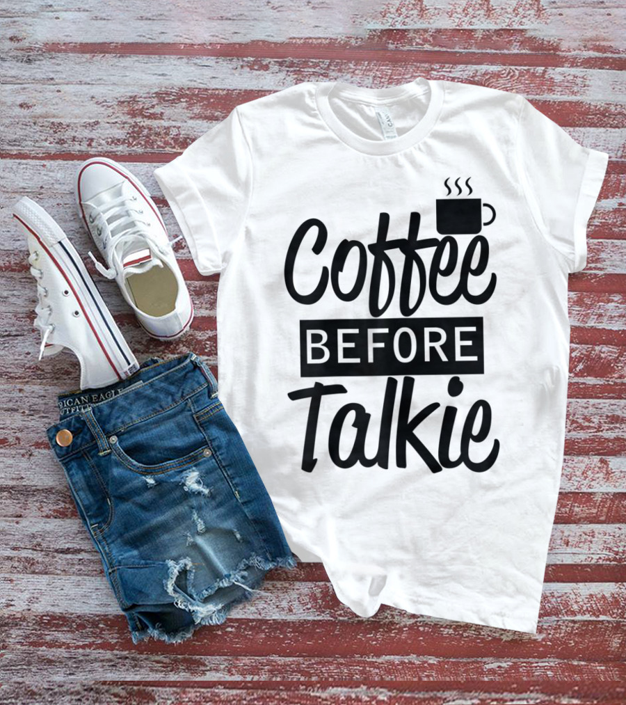 The Coffee Before Talkie Coffee Cup Shirt offers a regular fit. Made from 100% ring-spun cotton that is pre-shrunk to help maintain size and shape after washing. Features reinforced construction details for durability. Available in U.S. standard sizes S-5XL to accommodate various body types.