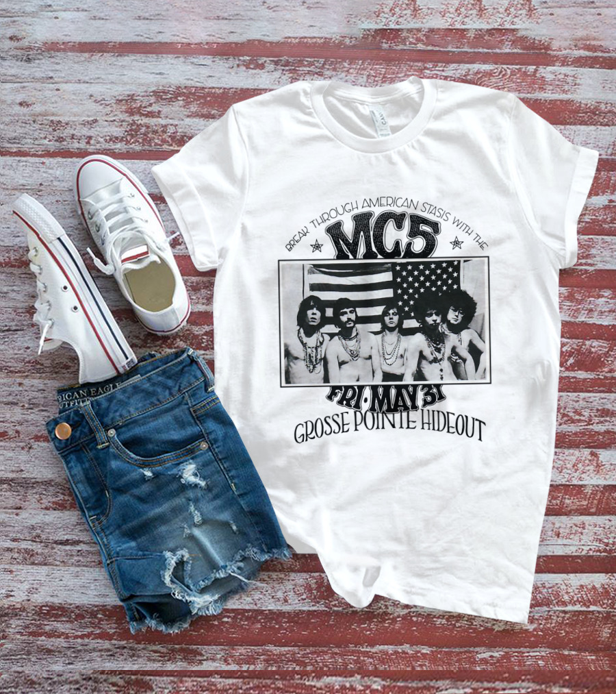 The Break Through American Stasis With The Mc5 Fri. May 31 Grosse Pointe Hideout Shirt offers a regular fit. Made from 100% ring-spun cotton that is pre-shrunk to help maintain size and shape after washing. Features reinforced construction details for durability. Available in U.S. standard sizes S-5XL to accommodate various body types.