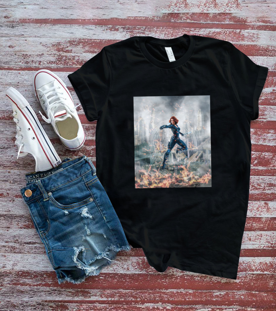 Avengers Cool Black Widow Action Scene Amidst Destruction T-Shirt
