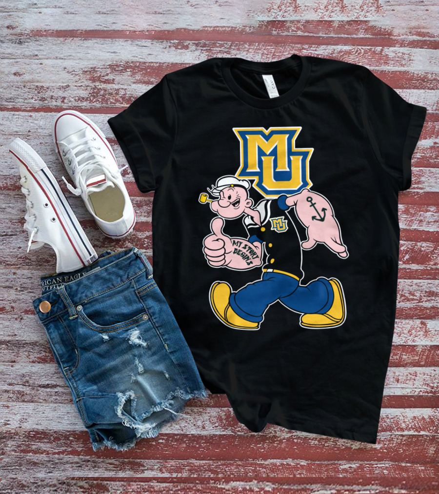 The Mu Marquette Golden Eagles My Story Begins Popeye Sailor Character Shirt offers a regular fit. Made from 100% ring-spun cotton that is pre-shrunk to help maintain size and shape after washing. Features reinforced construction details for durability. Available in U.S. standard sizes S-5XL to accommodate various body types.