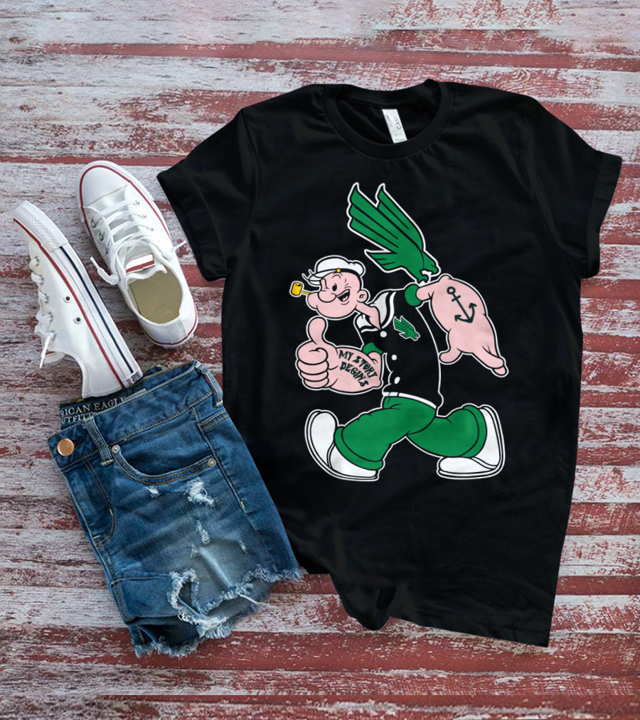 The North Texas Mean Green My Story Designs Popeye Sailor Cartoon Anchor Pipe Shirt offers a regular fit. Made from 100% ring-spun cotton that is pre-shrunk to help maintain size and shape after washing. Features reinforced construction details for durability. Available in U.S. standard sizes S-5XL to accommodate various body types.