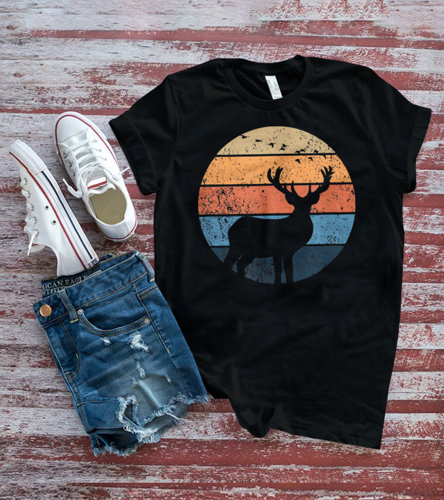 Deer Silhouette Retro Sunset With Flying Birds T-Shirt
