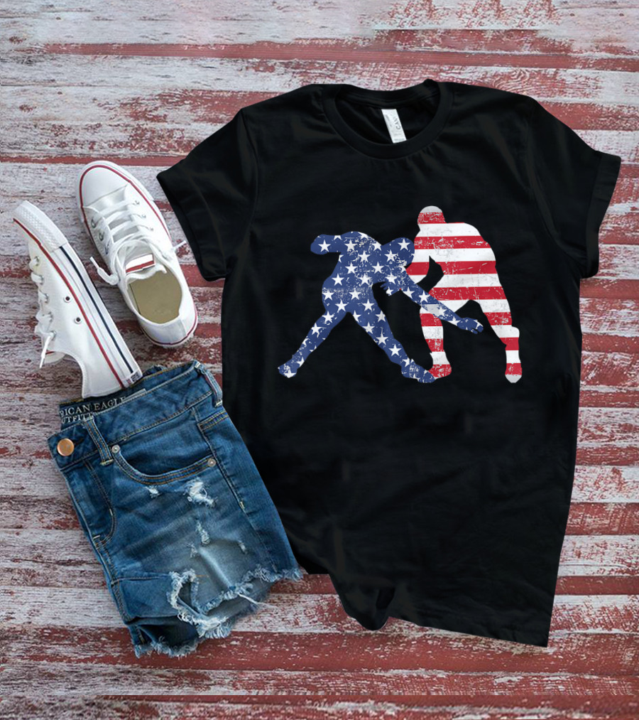 The Wrestling Dual Silhouette with US Flag Stars and Stripes for Fourth of July Shirt offers a regular fit. Made from 100% ring-spun cotton that is pre-shrunk to help maintain size and shape after washing. Features reinforced construction details for durability. Available in U.S. standard sizes S-5XL to accommodate various body types.