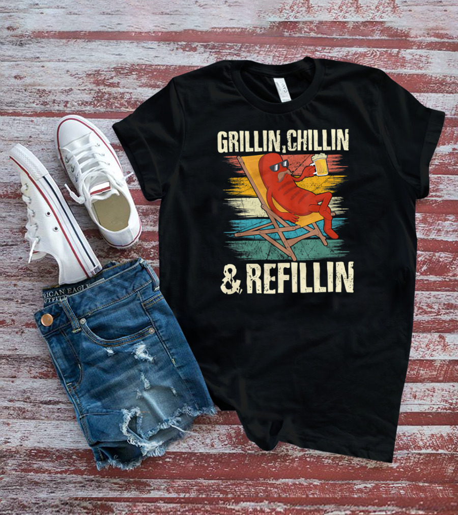 Grillin Chillin And Refillin Grill Master Relaxed Hot Dog With Beer In Lounge Chair T-Shirt