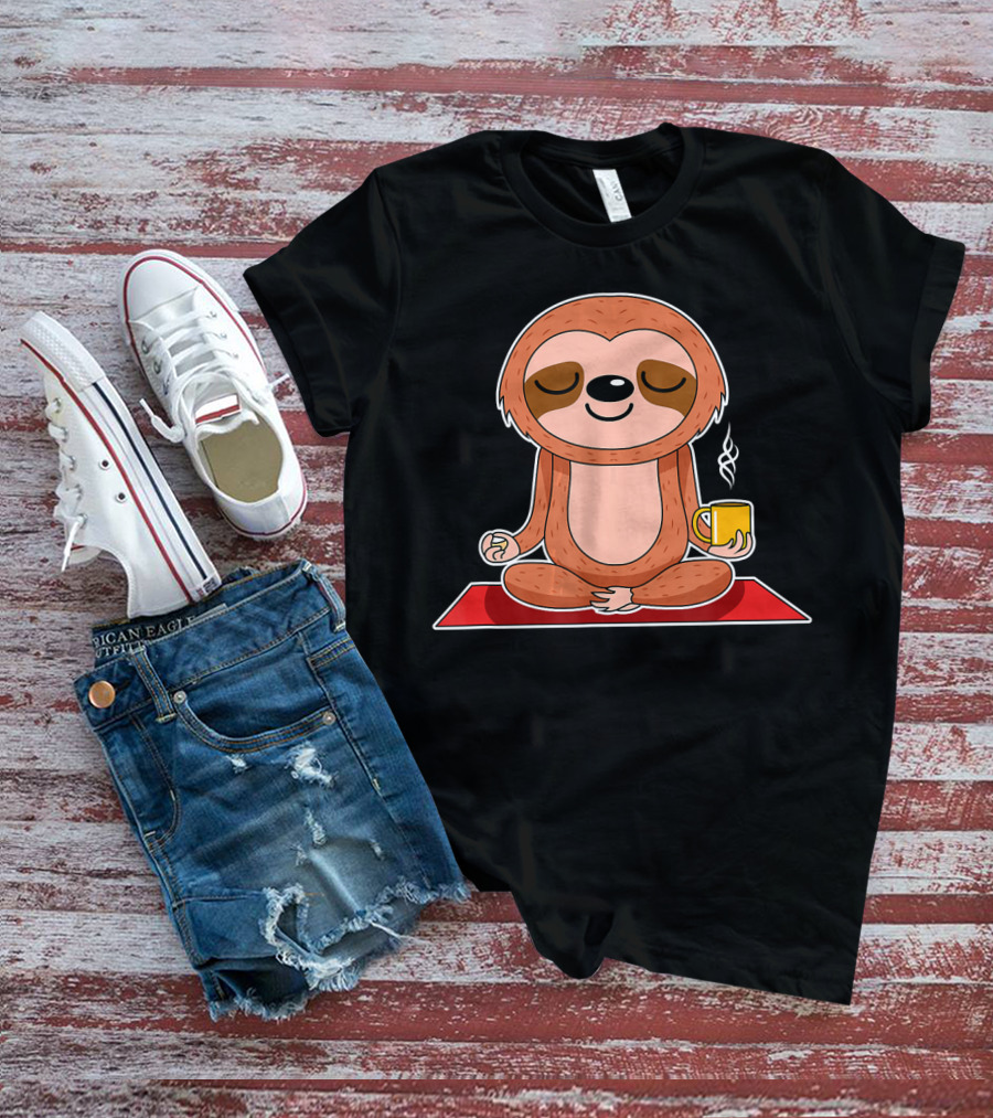 Yoga Sloth Funny Workout Fitness Casual Relaxing Meditation With Coffee T-Shirt