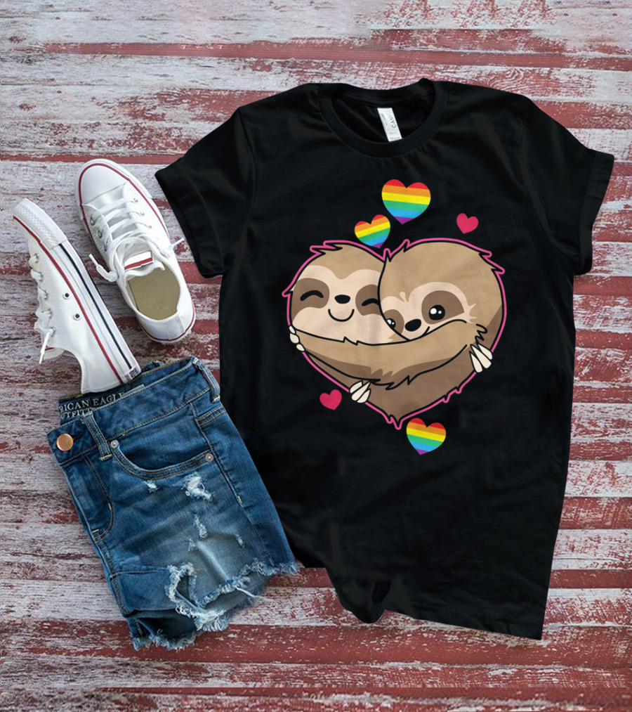 Valentines Day Sloth Heart With Rainbow Hearts T-Shirt