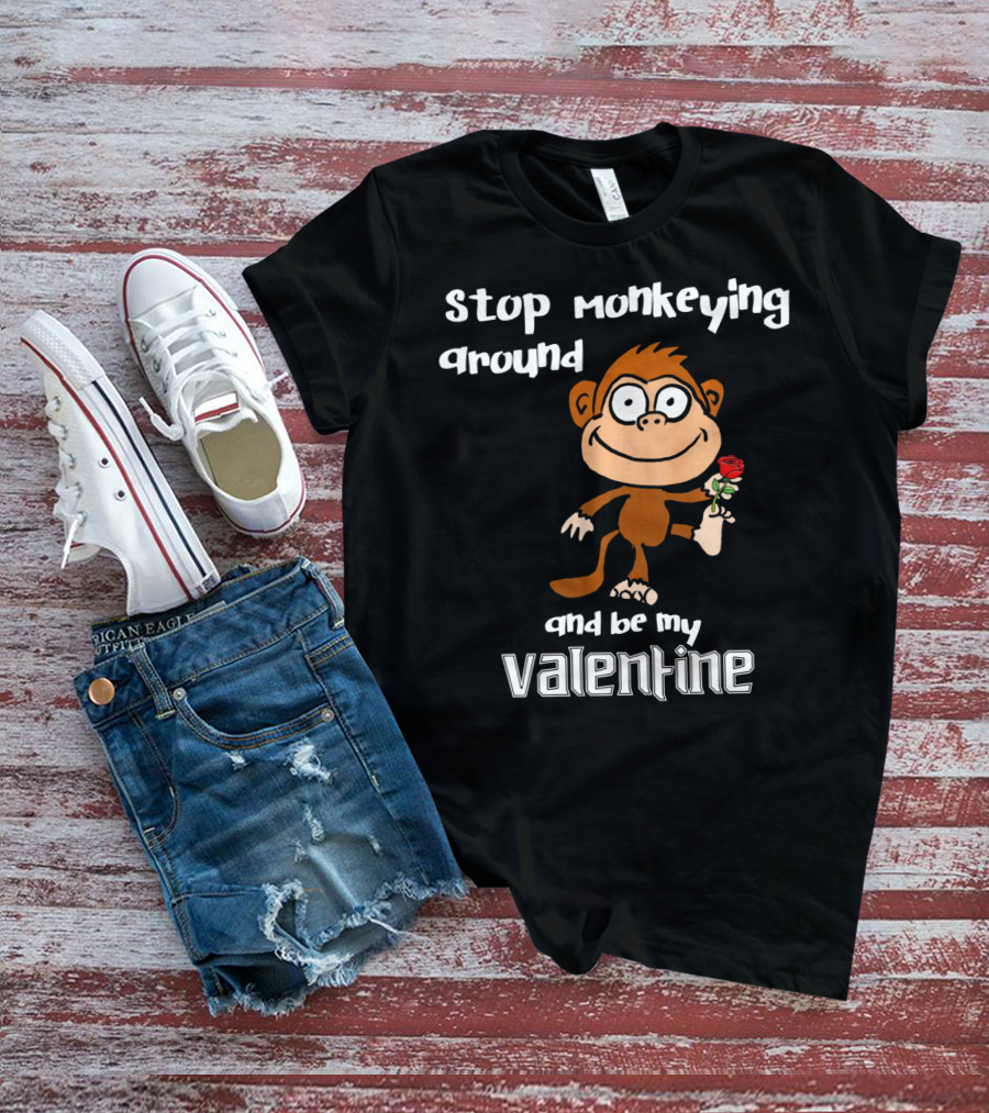 Stop Monkeying Around With Cute Cartoon Monkey And Be My Valentine With Red Rose T-Shirt