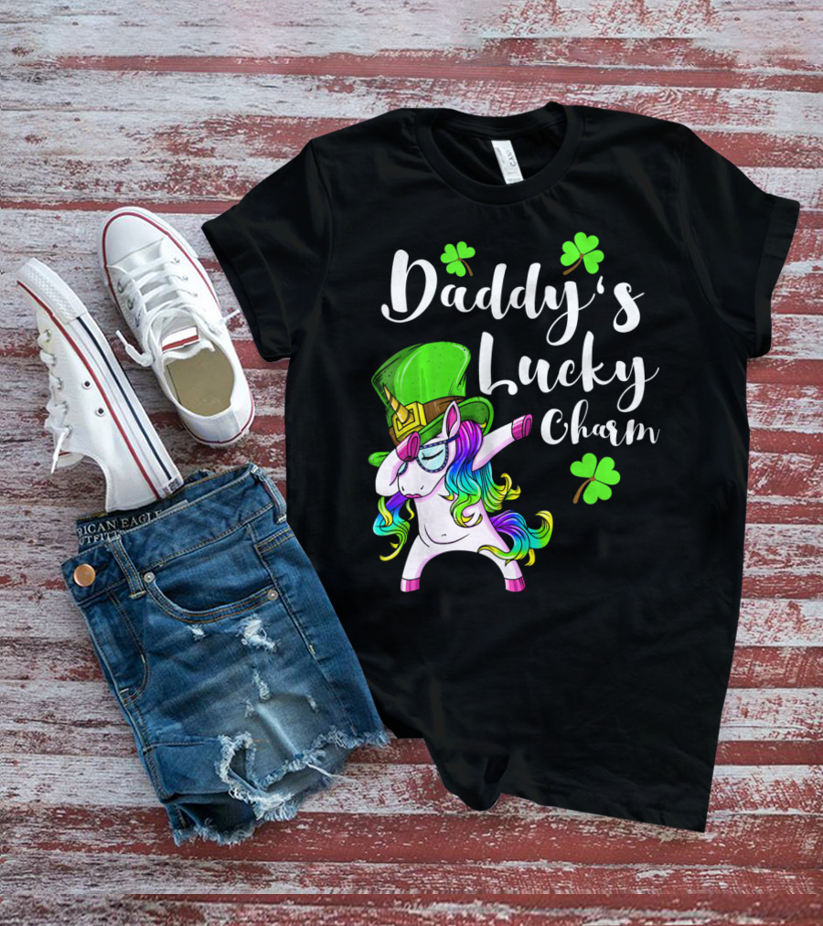 The Daddy's Lucky Charm St. Patrick's Day Unicorn with Shamrock Hat Shirt offers a regular fit. Made from 100% ring-spun cotton that is pre-shrunk to help maintain size and shape after washing. Features reinforced construction details for durability. Available in U.S. standard sizes S-5XL to accommodate various body types.