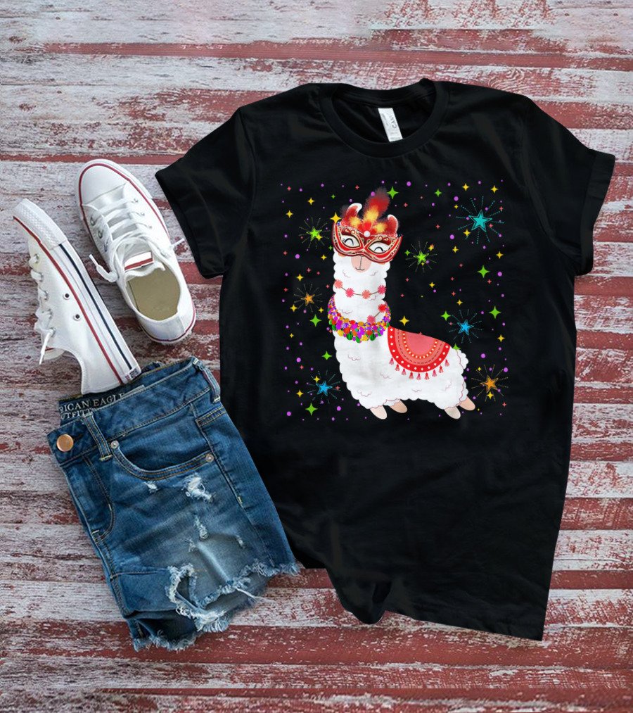 Llama Mardi Gras Mask Beads Colorful Festive Stars T-Shirt