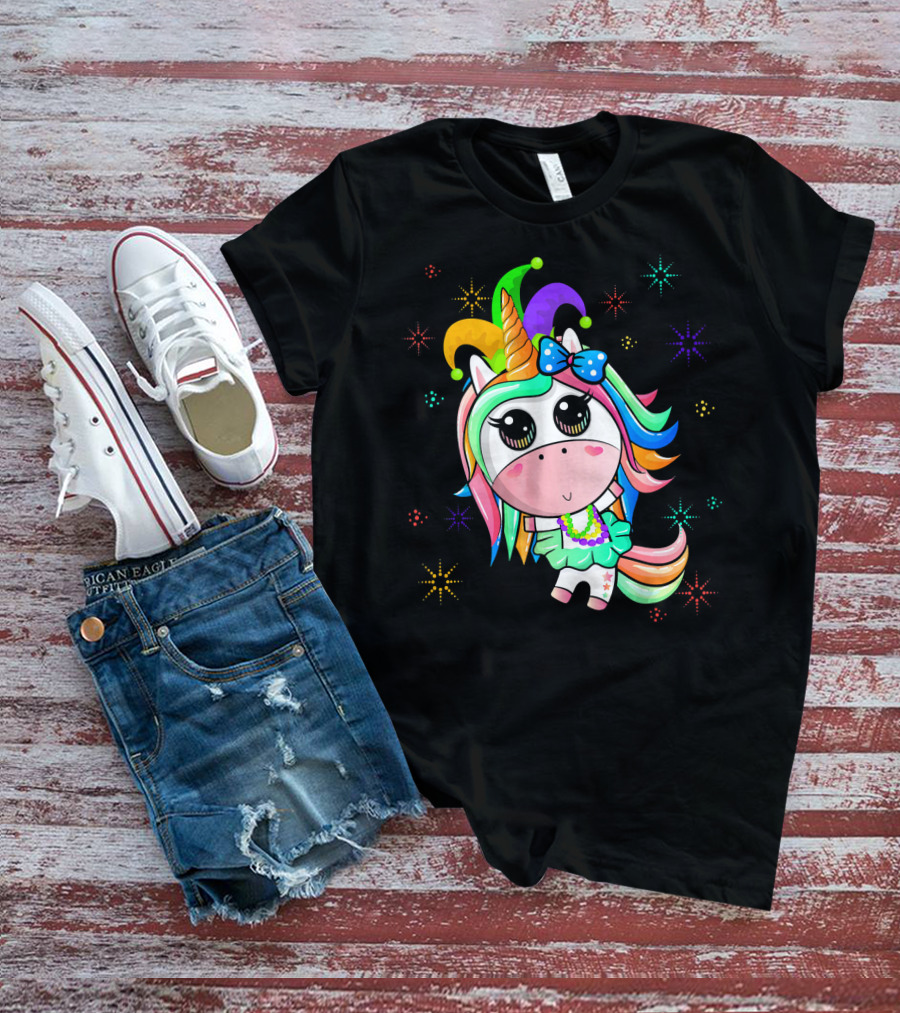 Mardi Gras Unicorn With Colorful Beads And Jester Hat T-Shirt
