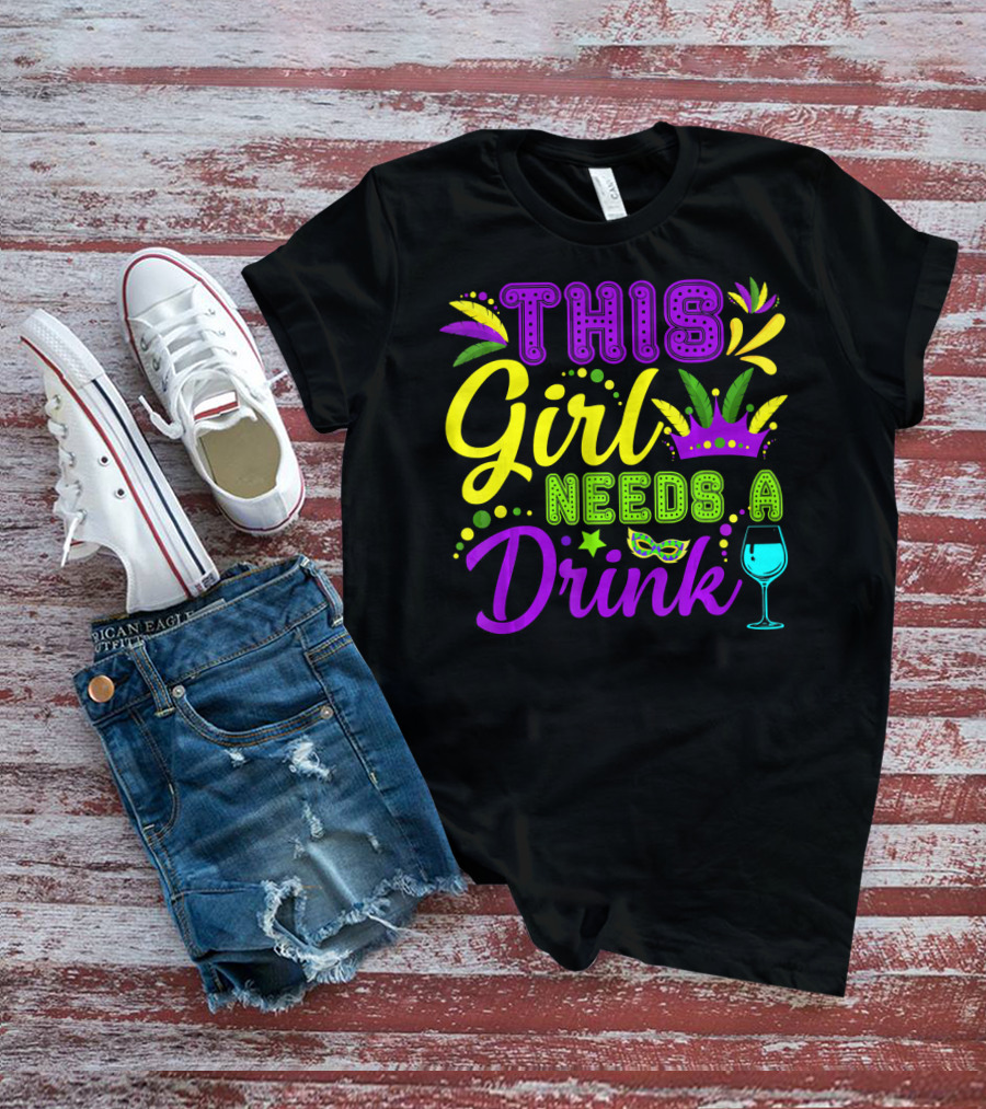 This Girl Needs A Drink Funny Mardi Gras Party Mask Crown Wine Glass T-Shirt