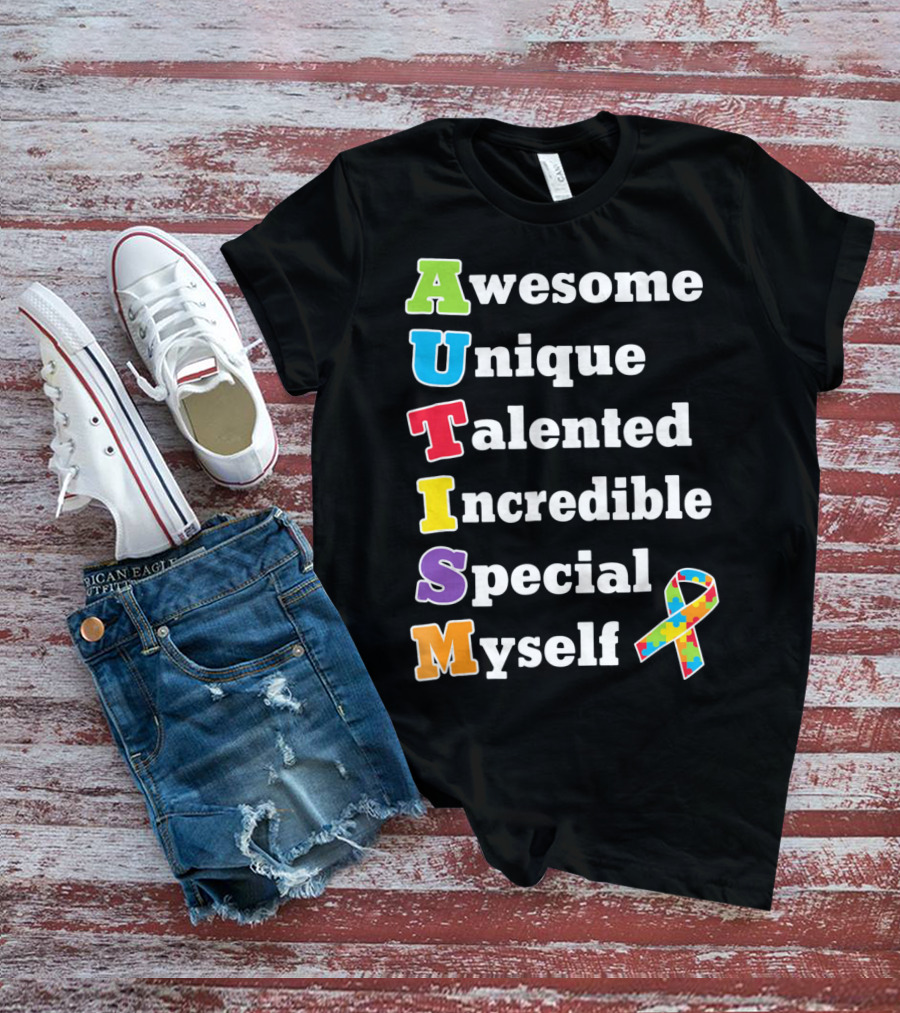 The Autism Awesome Unique Talented Incredible Special Myself Awareness Puzzle Shirt offers a regular fit. Made from 100% ring-spun cotton that is pre-shrunk to help maintain size and shape after washing. Features reinforced construction details for durability. Available in U.S. standard sizes S-5XL to accommodate various body types.