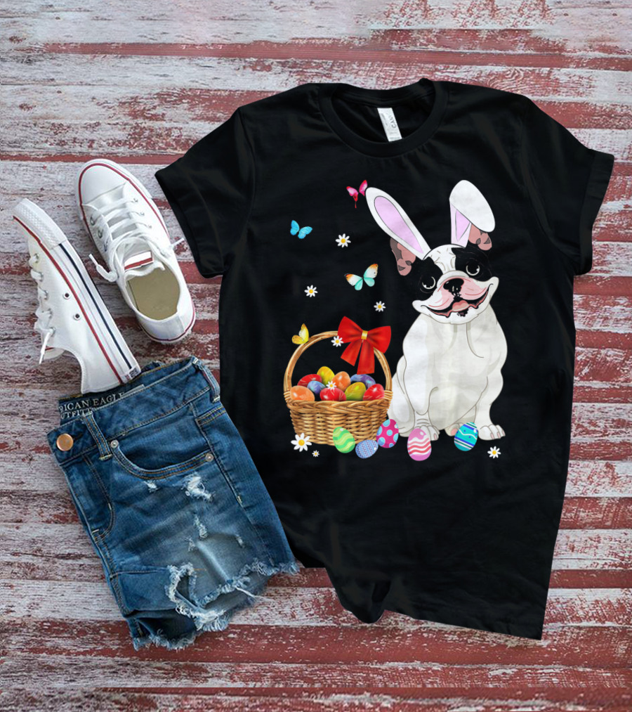 French Bulldog With Bunny Ears And Easter Egg Basket With Butterflies And Flowers T-Shirt