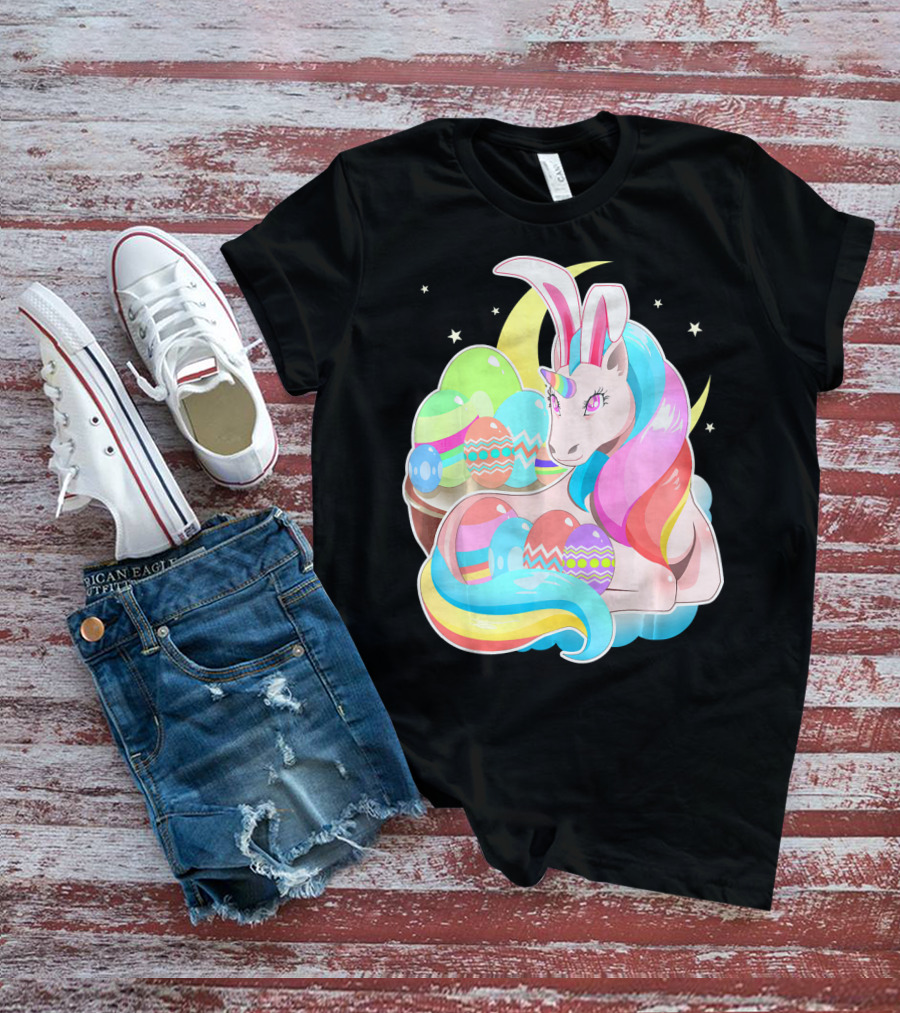 Unicorn Easter Bunny Ears Holiday Pastel Eggs And Moon Stars T-Shirt