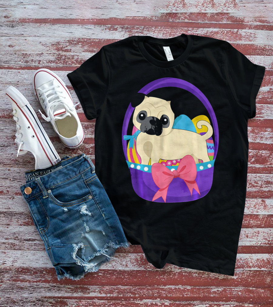 Easter Pug Dog In Colorful Basket With Eggs And Bow T-Shirt