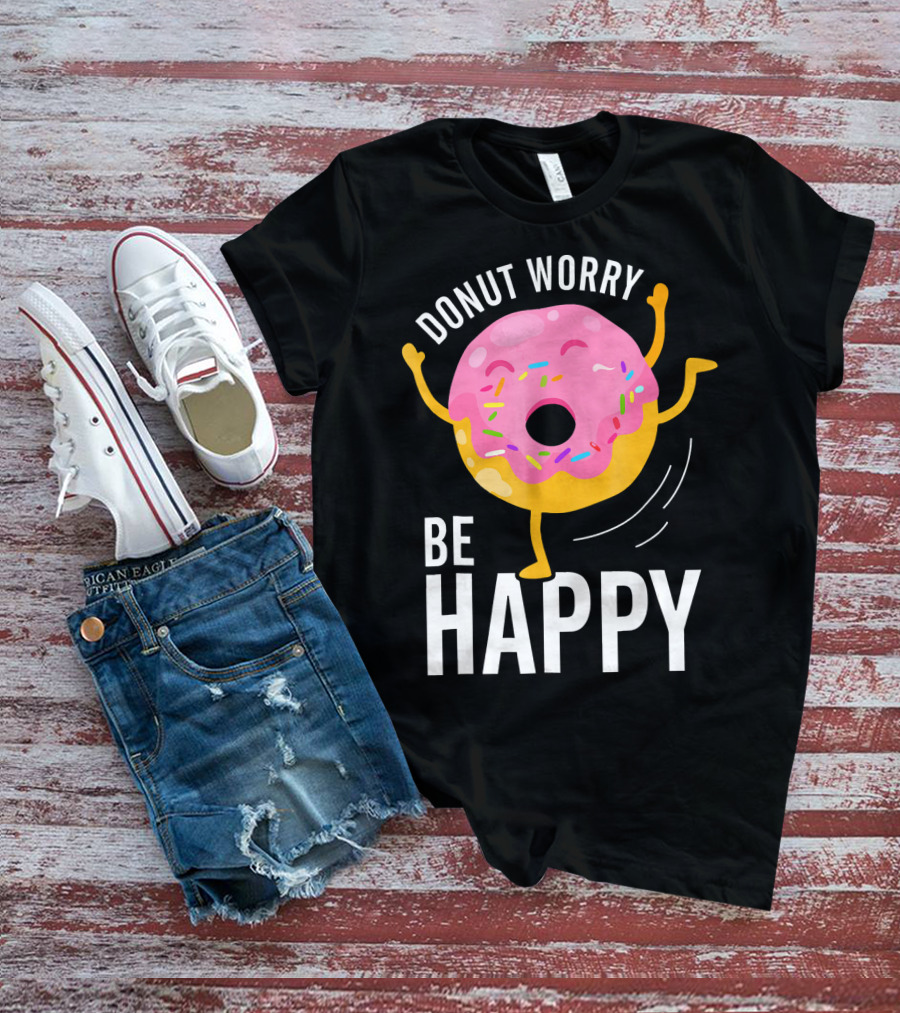 The Donut Worry Be Happy Pink Sprinkled Dancing Donut Shirt offers a regular fit. Made from 100% ring-spun cotton that is pre-shrunk to help maintain size and shape after washing. Features reinforced construction details for durability. Available in U.S. standard sizes S-5XL to accommodate various body types.
