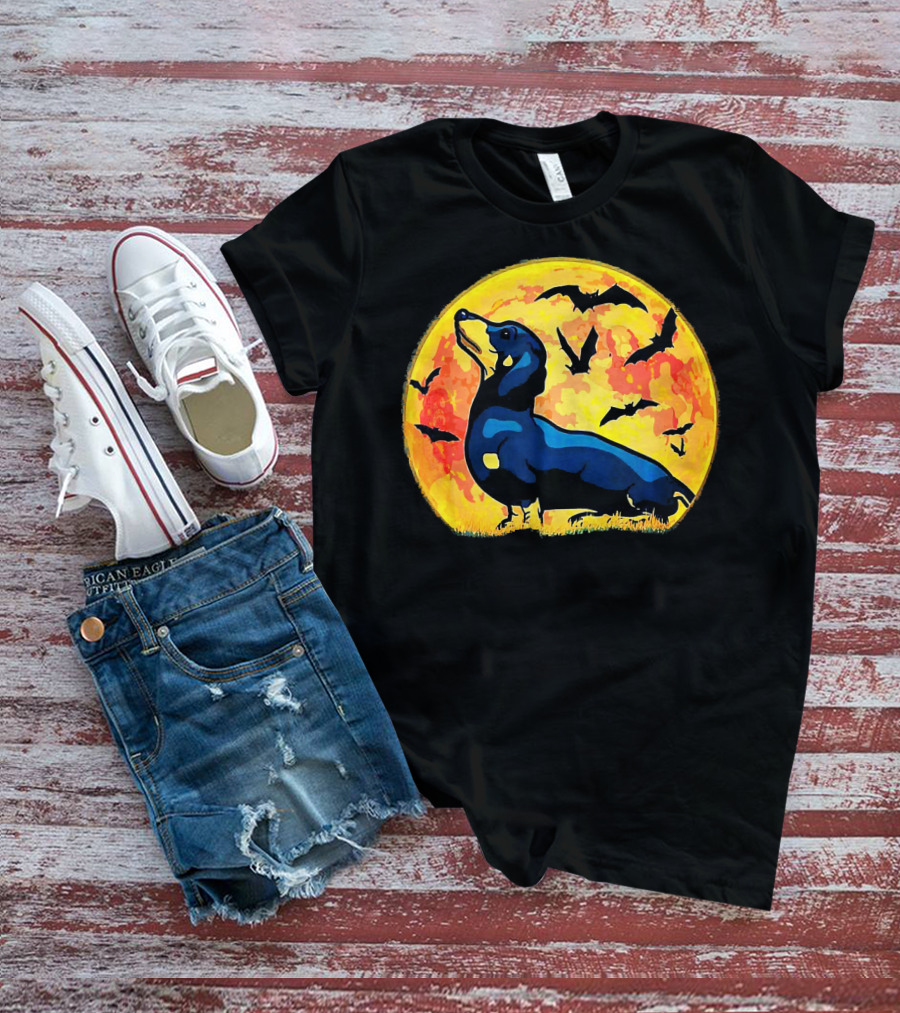 Dachshund Halloween Moon With Flying Bats T-Shirt