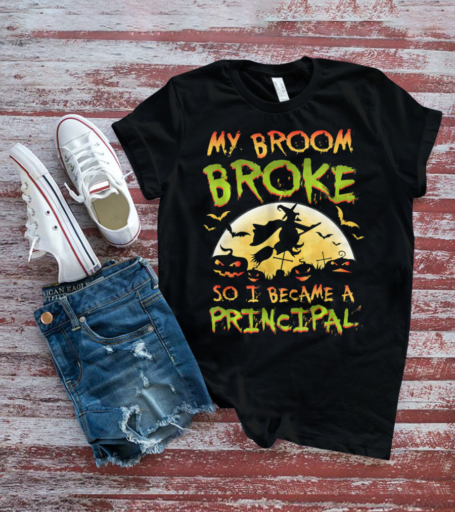 My Broom Broke So I Became A Principal Halloween Witch Moon Jack-O'-Lanterns Bats T-Shirt