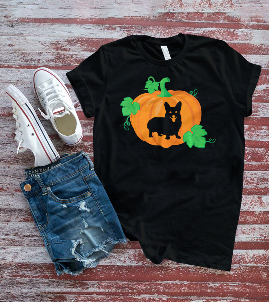 Corgi Dog Pumpkin Halloween Silhouette With Leaves T-Shirt