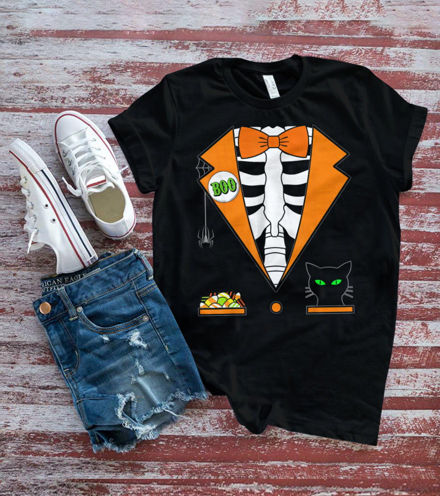 Easy Halloween Costume Orange Skeleton Tuxedo With Candy Bowl And Black Cat T-Shirt