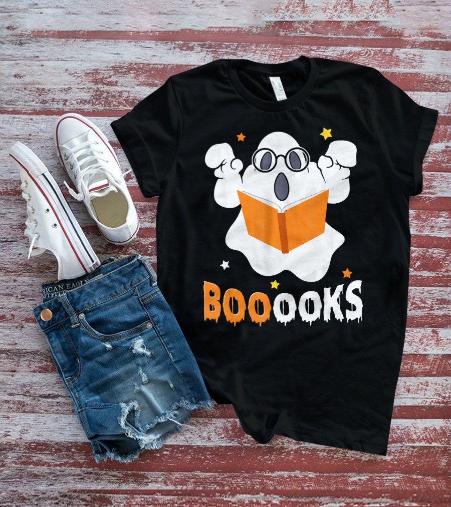 Booooks Ghost With Glasses Holding Orange Book And Stars T-Shirt