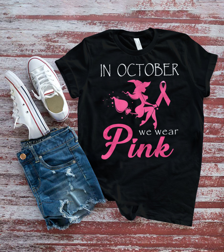 The In October We Wear Pink Witch Shirt offers a regular fit. Made from 100% ring-spun cotton that is pre-shrunk to help maintain size and shape after washing. Features reinforced construction details for durability. Available in U.S. standard sizes S-5XL to accommodate various body types.