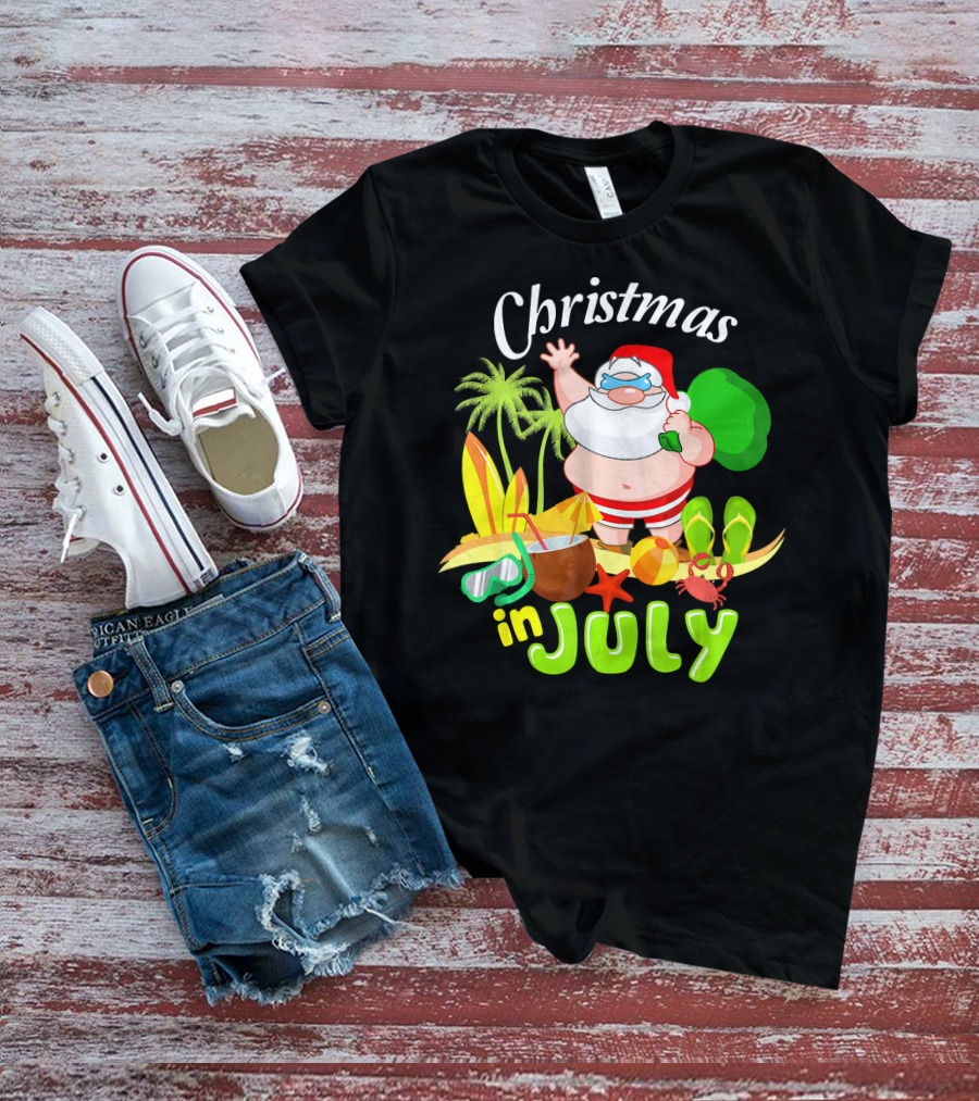 Christmas In July Santa With Surfboards, Palm Trees, Tropical Drinks, And Beach Accessories T-Shirt